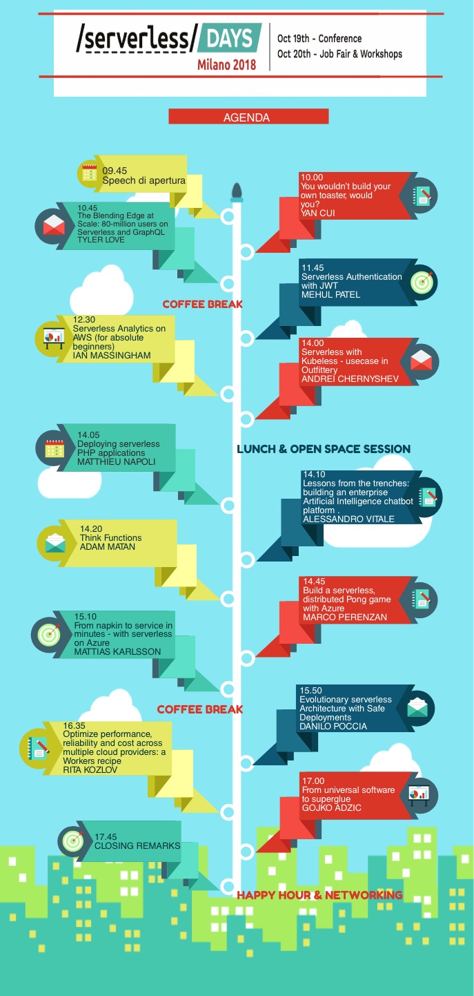 Insomma, ServerlessDays Milano rappresenta una tappa obbligata per chi mastica pane e serverless. I biglietti stanno andando via velocemente, quindi acquistatelo il prima possibile. Vi lasciamo con l’agenda ufficiale di ServerlessDays Milano 2018.